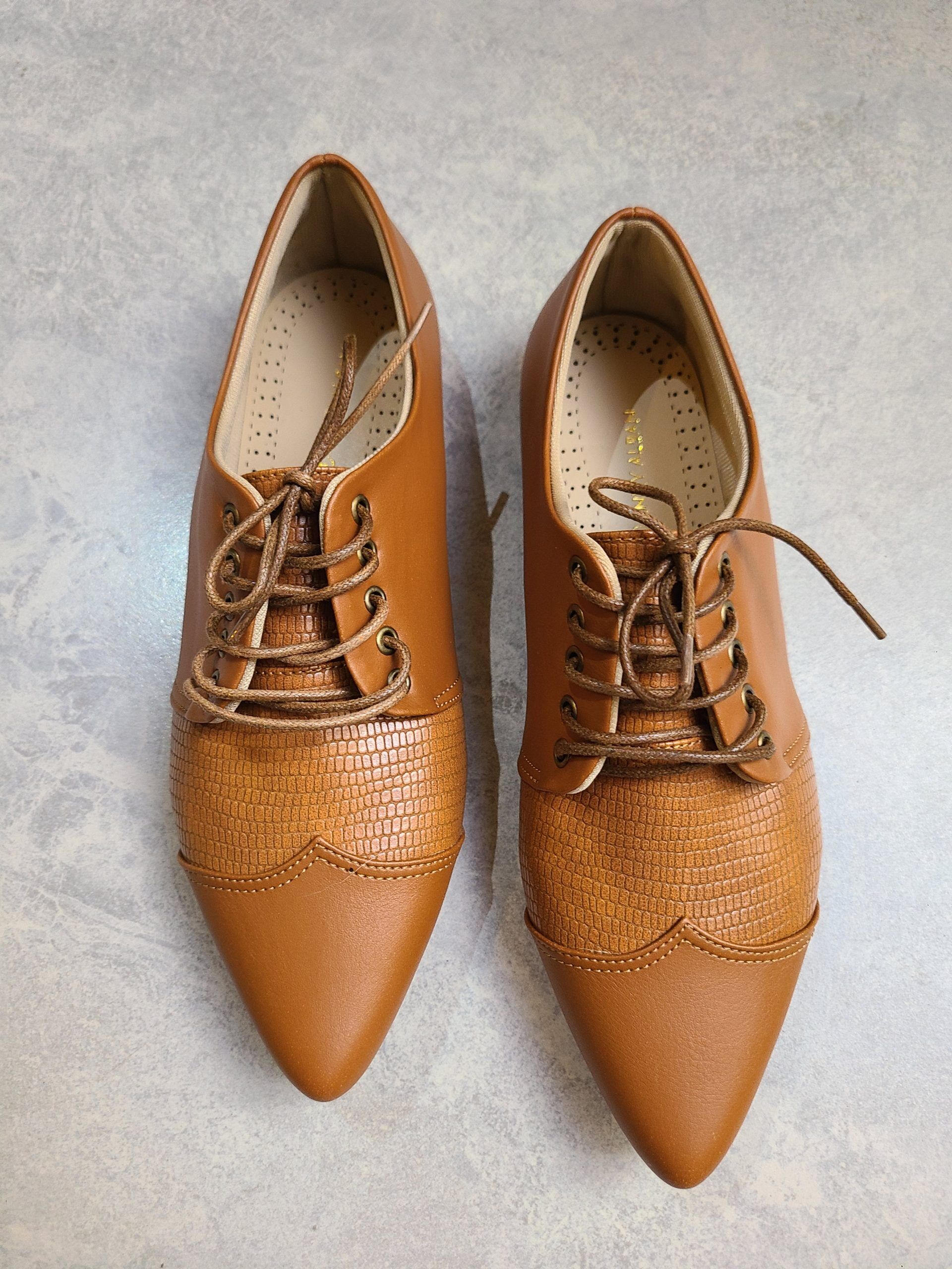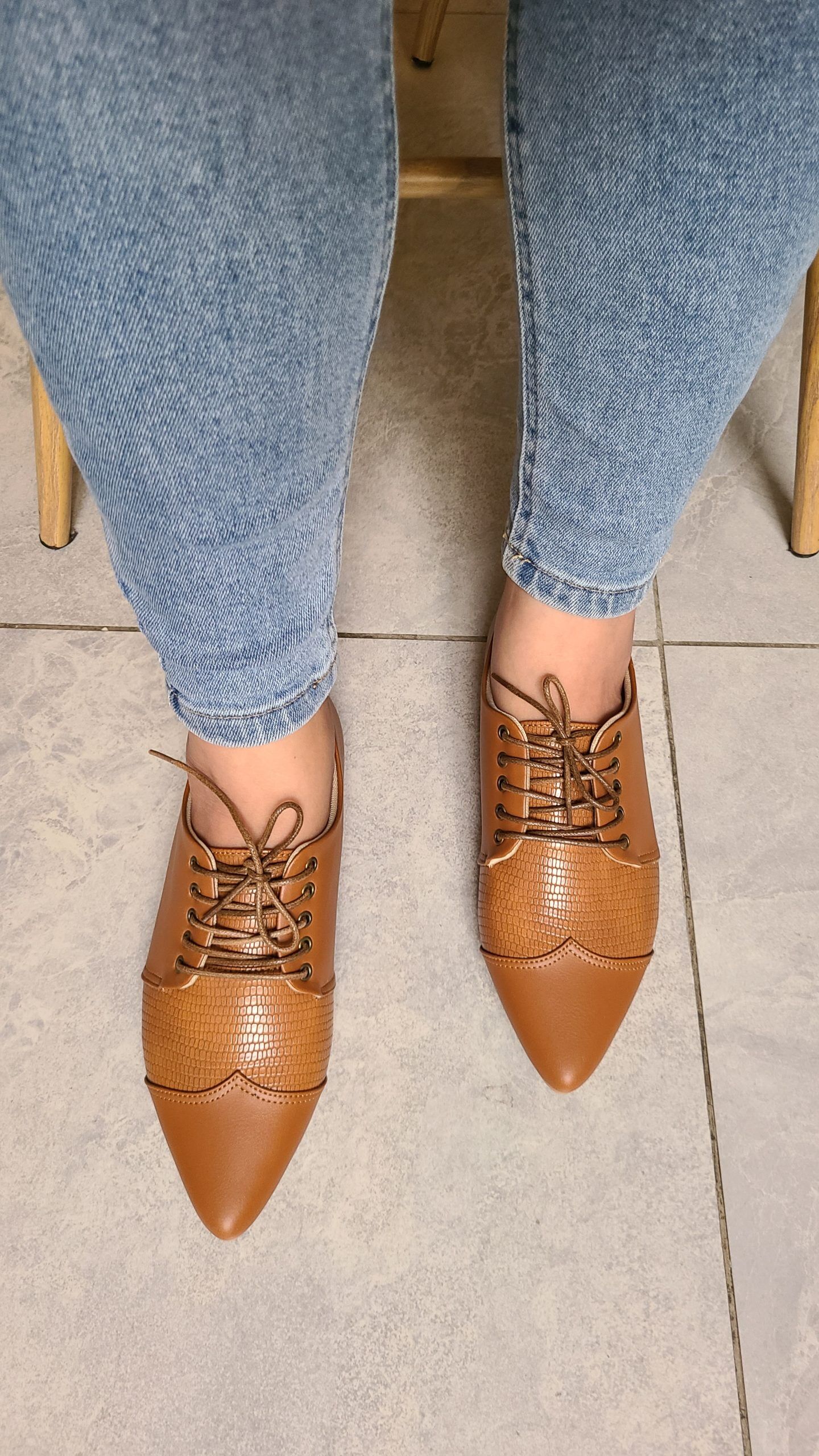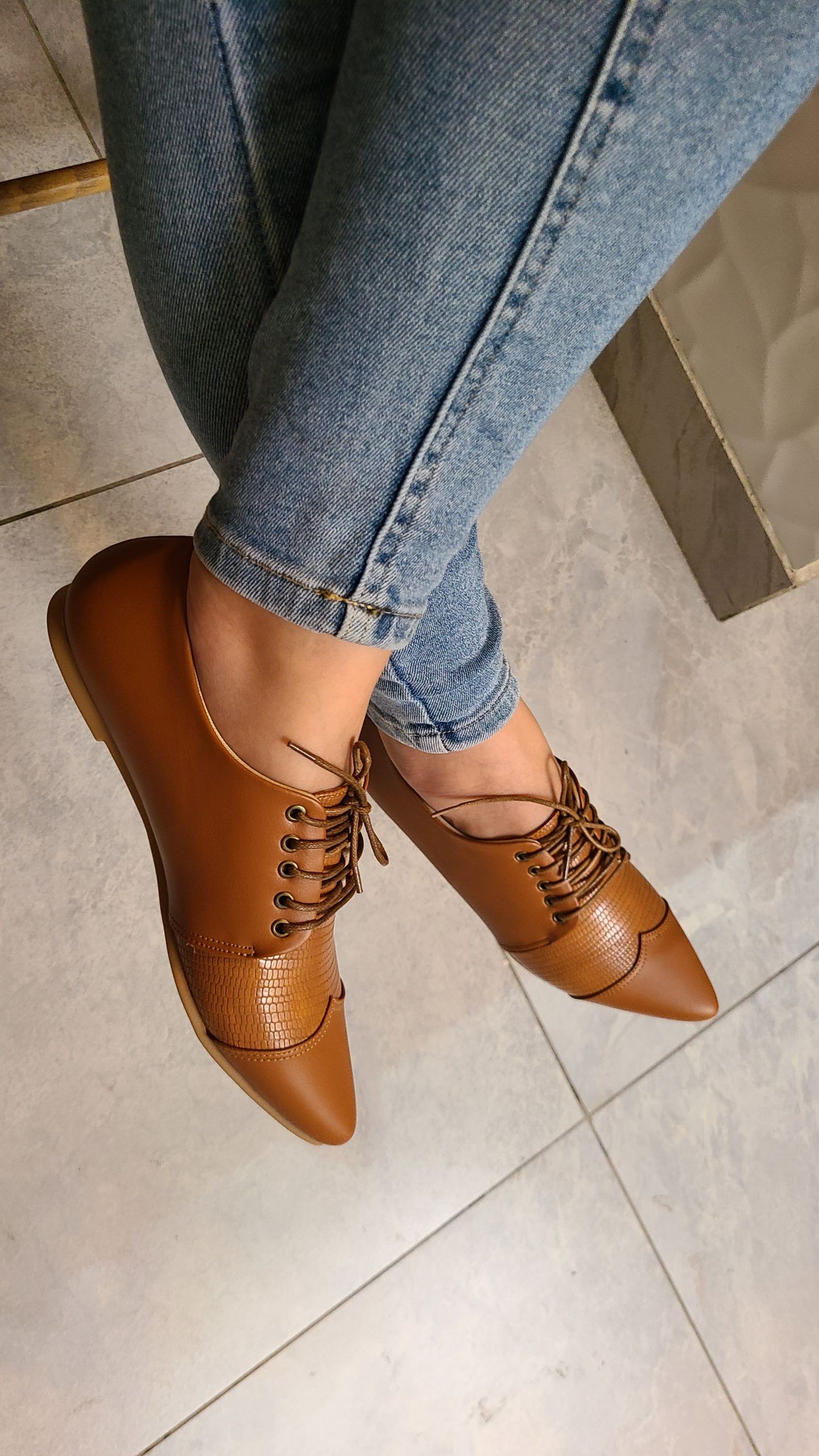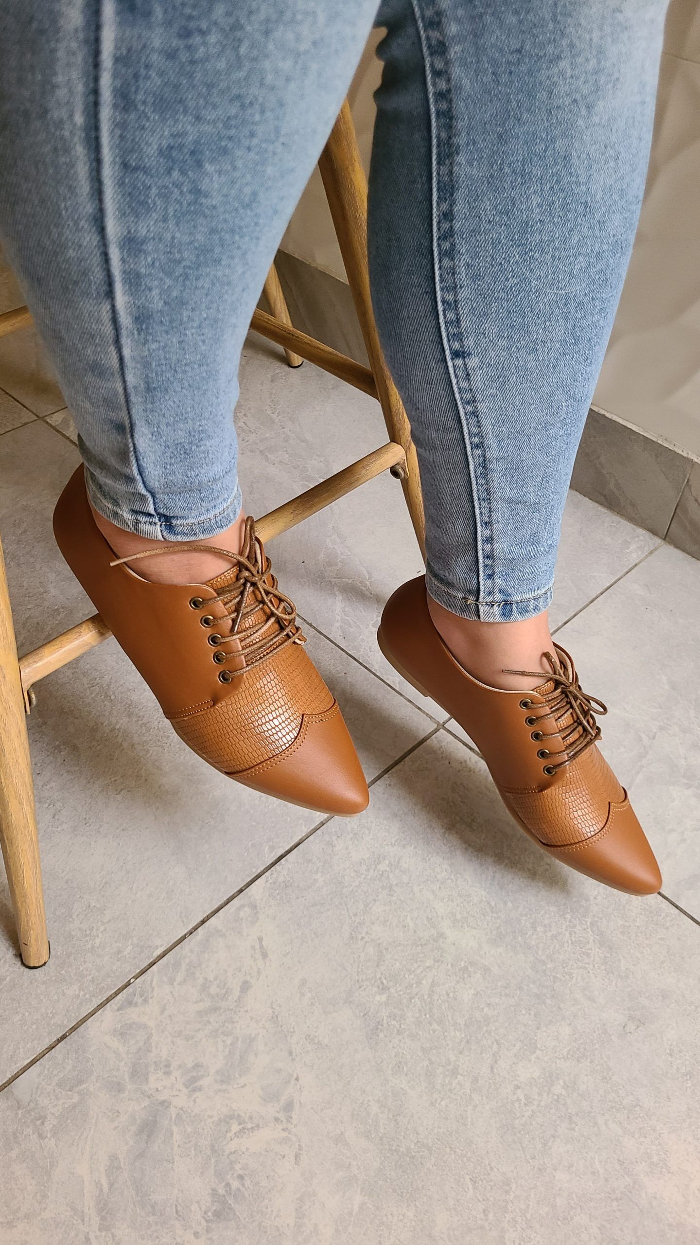 Mocasín Punton Oxford estilo flat, color miel con cordones.